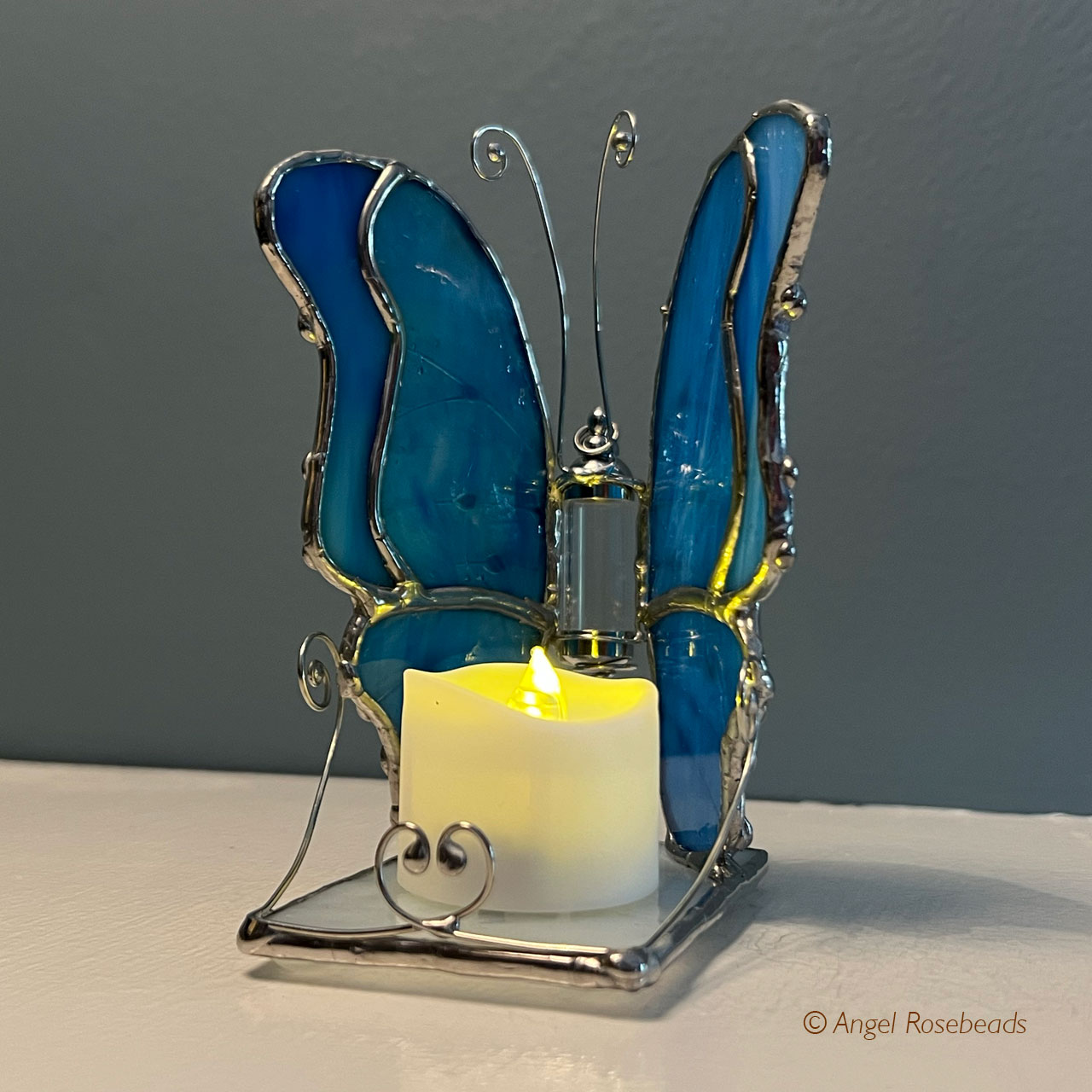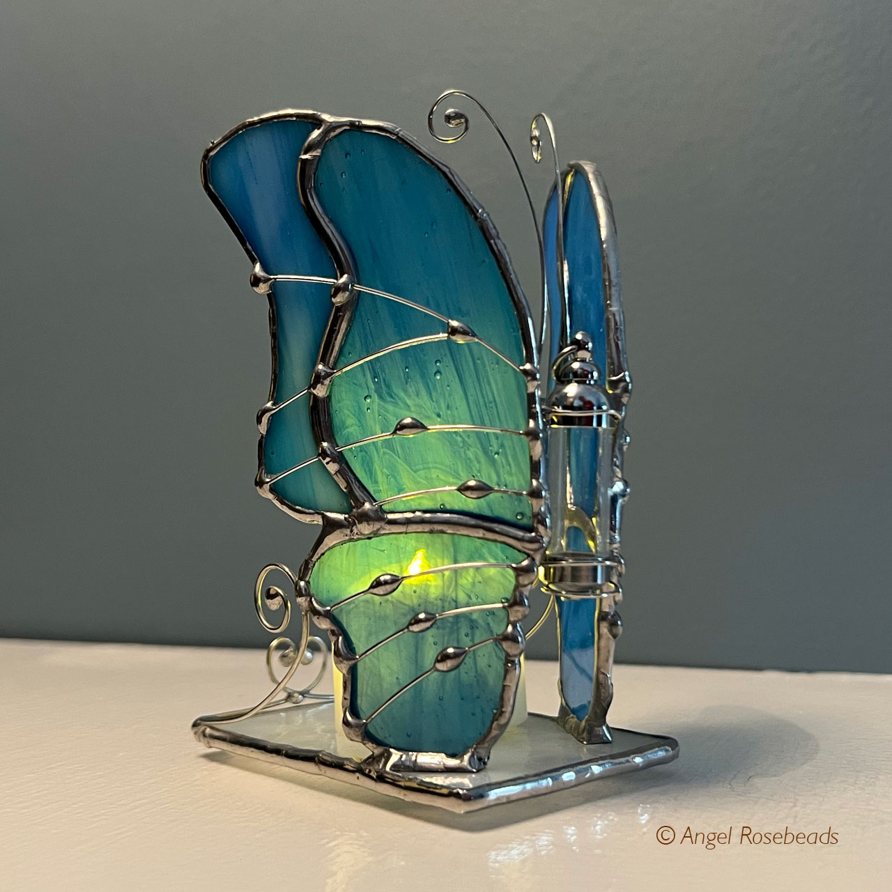 This Stained Glass Butterfly stands 5" tall. Its body is a 1 1/2" tall glass vessel which can hold flower pieces, sand, small shells, ashes or anything that honors a person or special moment. It will not hold liquid.