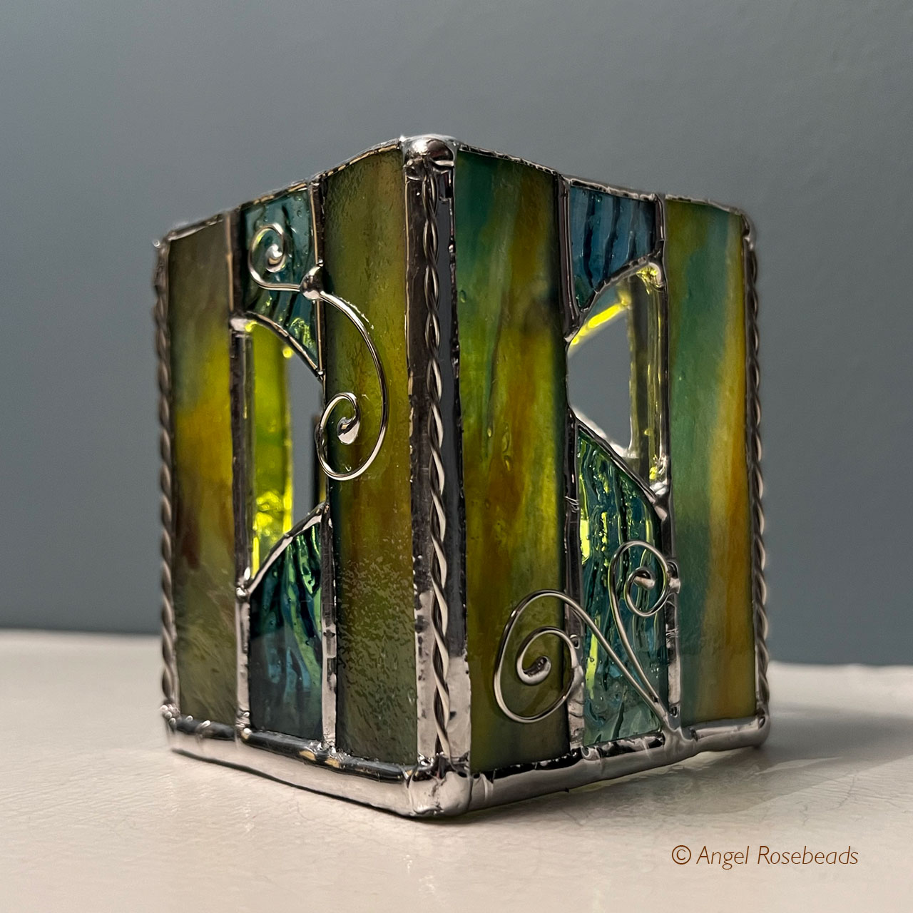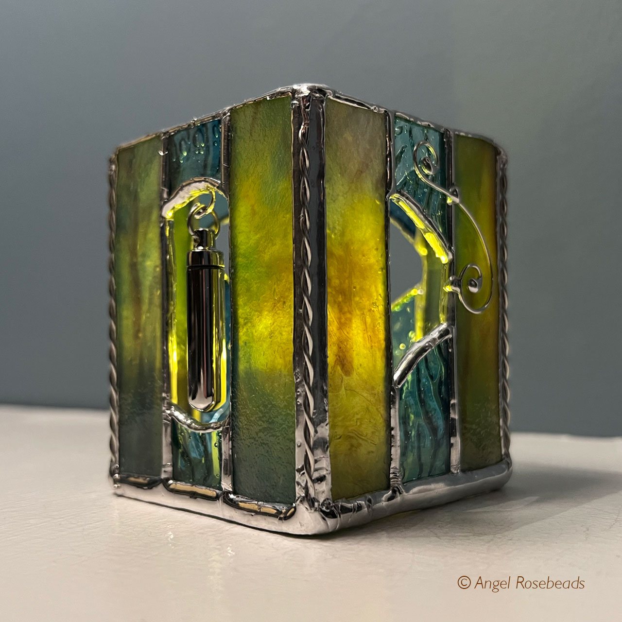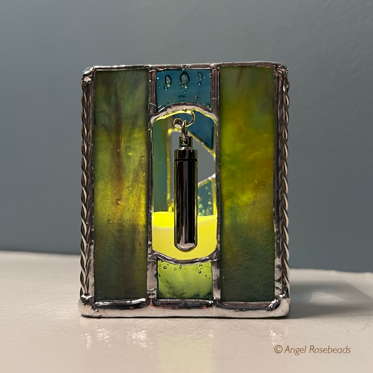 The stainless steel vessel holds ashes discretely in this stained glass candle holder. Stands 3" tall and 2 3/4" wide, glass and decorative wire scrolls. Vessel is 1 1/2" tall x 3/8" which can be engraved and worn on a chain as well.