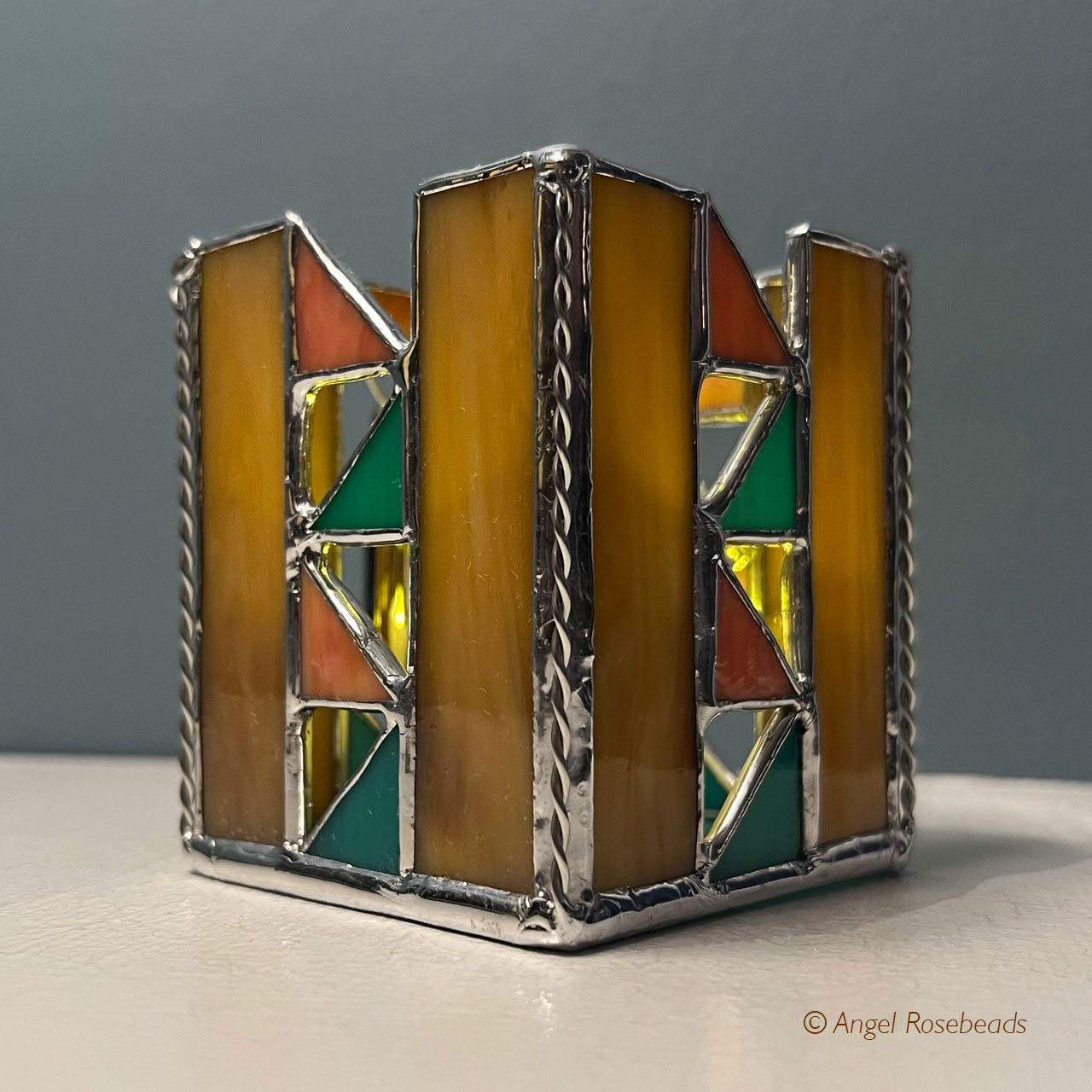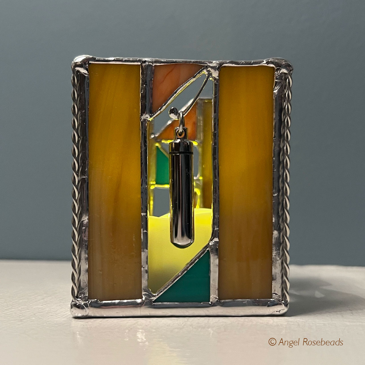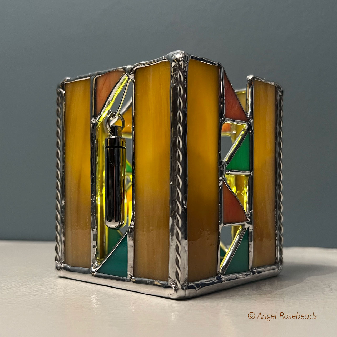 The stainless steel vessel holds ashes discretely in this stained glass candle holder. Stands 3" tall and 2 3/4" wide, glass and decorative wire scrolls. Vessel is 1 1/2" tall x 3/8" which can be engraved and worn on a chain as well.