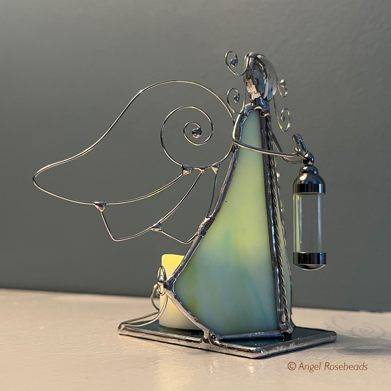 This Stained Glass Angel stands 5" tall and holds a 1 1/2" tall glass vessel which can hold flower pieces, sand, small shells, ashes or anything that honors a person or special moment. It will not hold liquid.