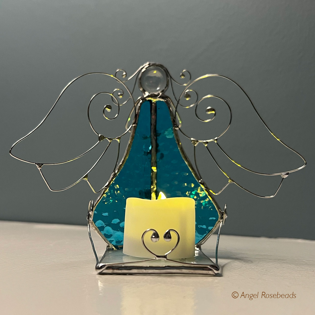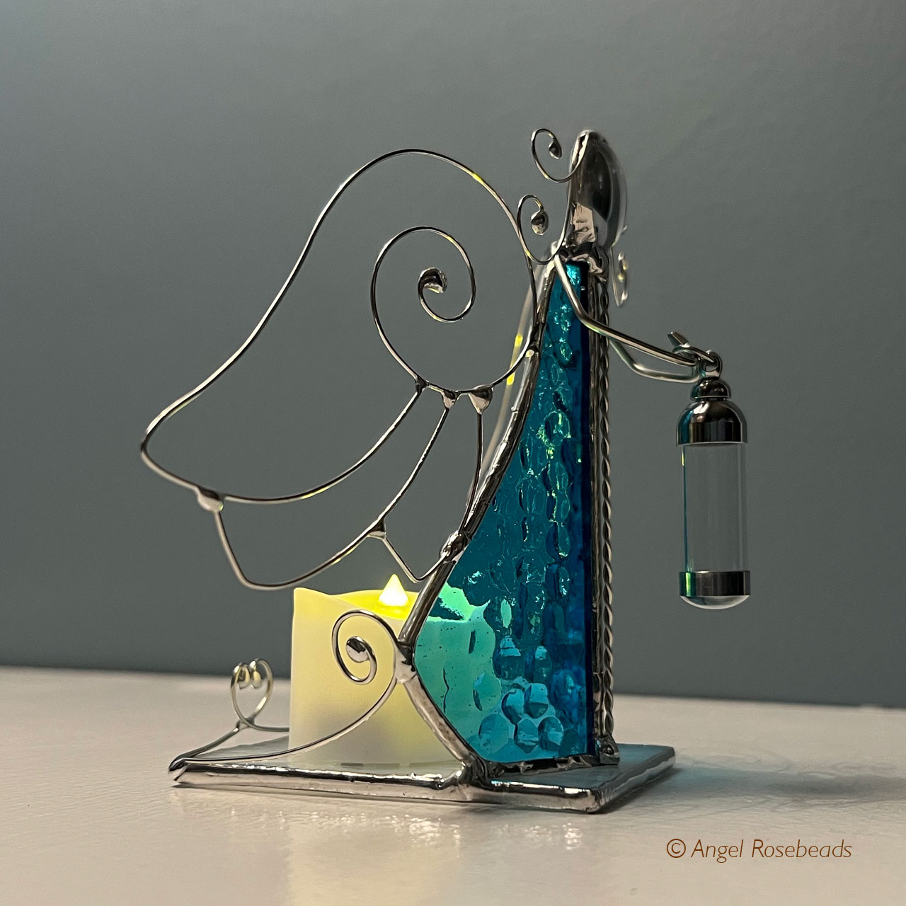 This Stained Glass Angel stands 5" tall and holds a 1 1/2" tall glass vessel which can hold flower pieces, sand, small shells, ashes or anything that honors a person or special moment. It will not hold liquid.
