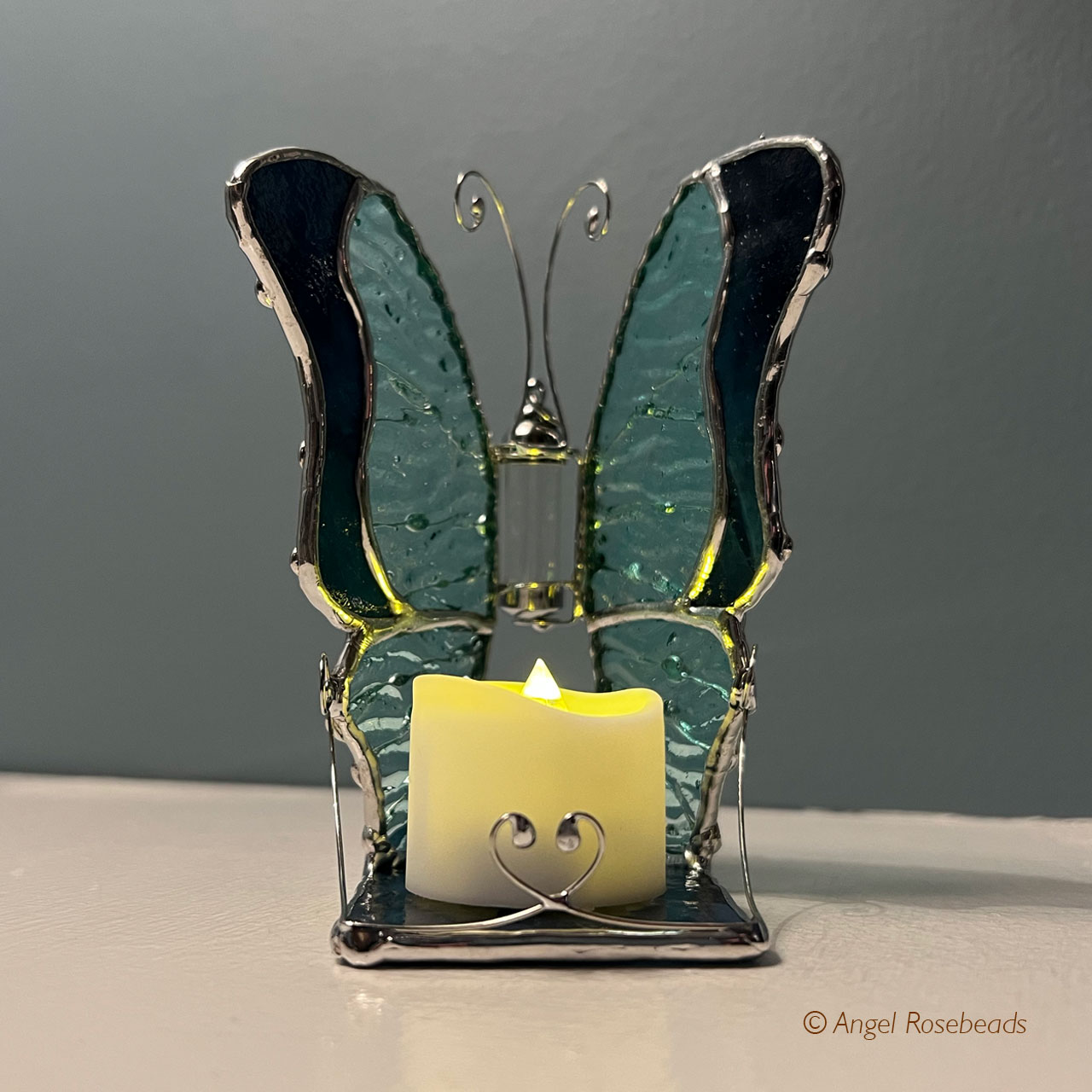 This Stained Glass Butterfly stands 5" tall. Its body is a 1 1/2" tall glass vessel which can hold flower pieces, sand, small shells, ashes or anything that honors a person or special moment. It will not hold liquid.