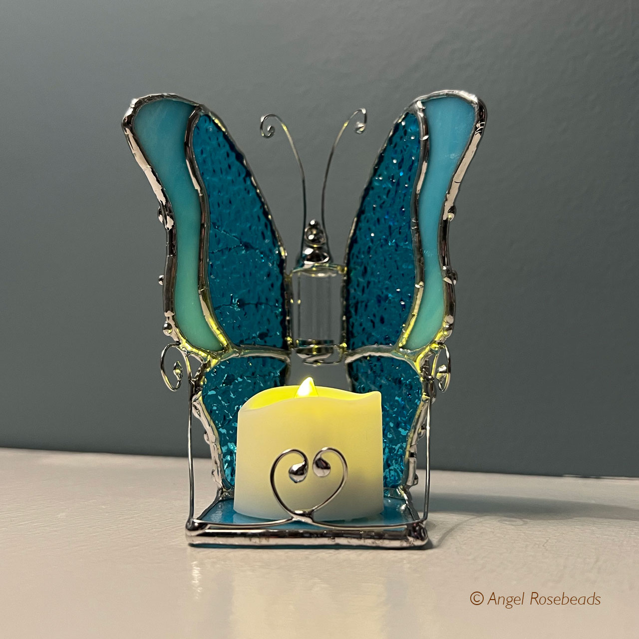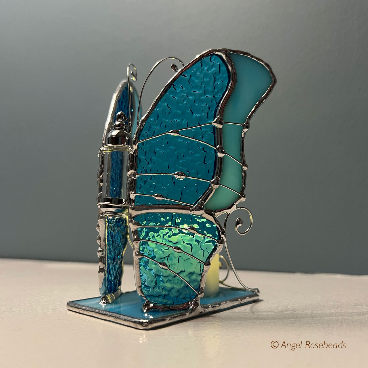 This Stained Glass Butterfly stands 5" tall. Its body is a 1 1/2" tall glass vessel which can hold flower pieces, sand, small shells, ashes or anything that honors a person or special moment. It will not hold liquid.